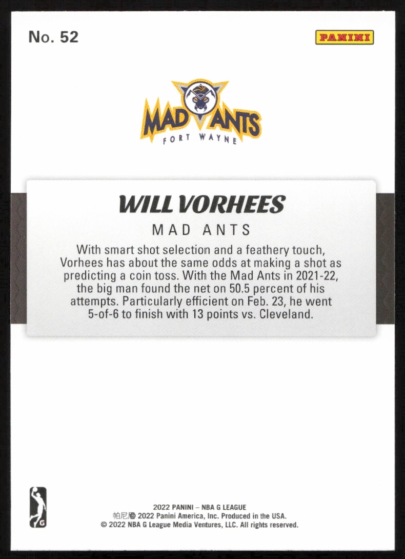 This BasketballΒ card, from 2021-22 is part of the Panini NBA G LeagueΒ card set. Will Vorhees is featured and has a card number of 52.