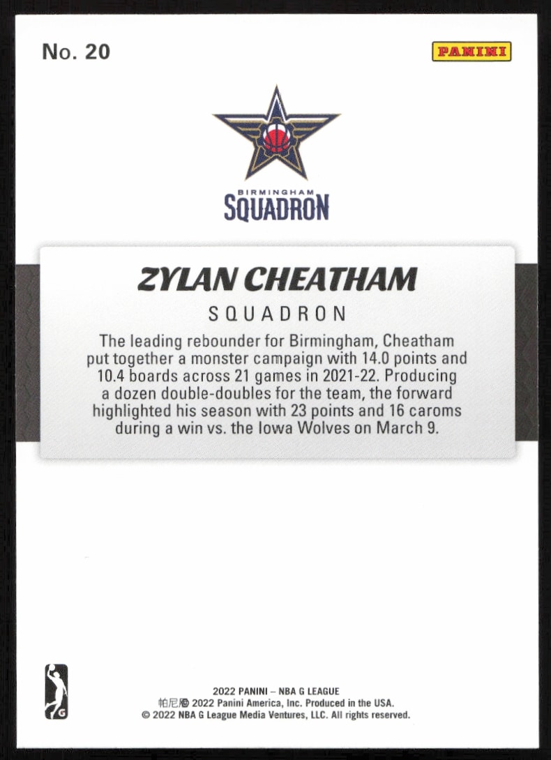 This BasketballΒ card, from 2021-22 is part of the Panini NBA G LeagueΒ card set. Zylan Cheatham is featured and has a card number of 20.