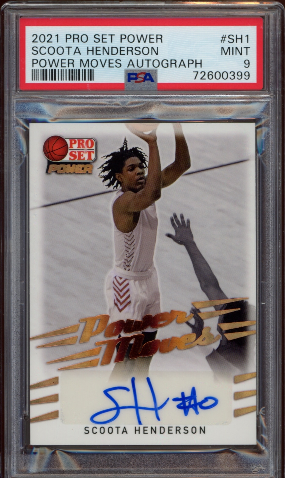 This 2021-22 Pro Set Power Scoota Henderson Power Moves Gold #PM-SH1 (Auto) (PSA 9) trading card is an incredible collectible that any serious sports memorabilia collector would be proud to display. This card features an autograph and a picture of Scoota Henderson, one of the best power forwards of all time. This card has been certified with a Professional Sports Authentic (PSA) 9 grade, showing that it is in excellent condition and is an incredible find. Add this amazing card to your growing collection today!