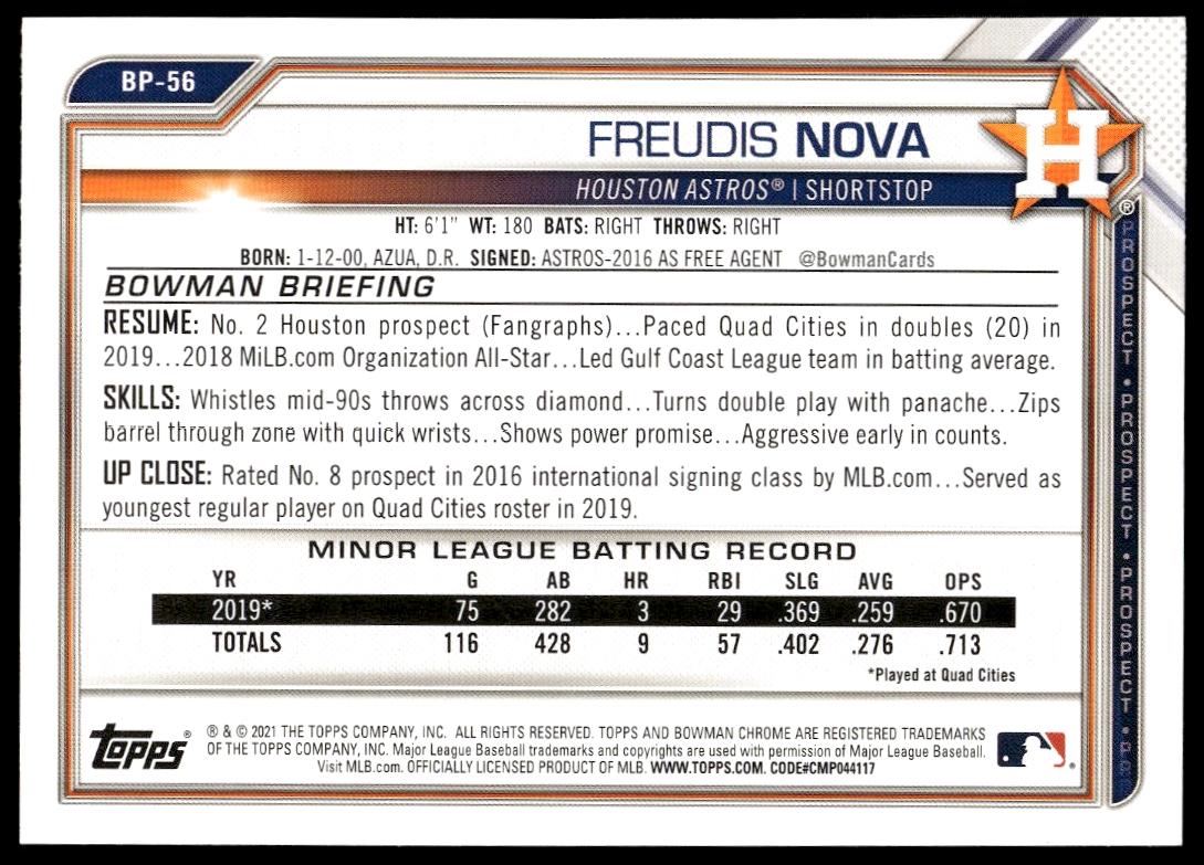 This Baseball card, from 2021 is part of the Bowman  card set. Freudis Nova is featured and has a card number of BFE-56.