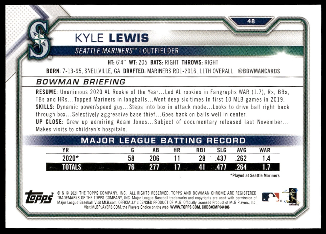 This Baseball card, from 2021 is part of the Bowman card set. Kyle Lewis is featured and has a card number of 48.