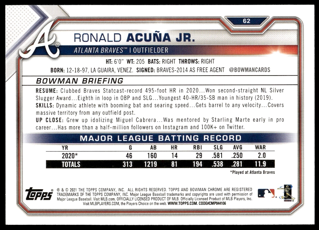 This Baseball card, from 2021 is part of the Bowman card set. Ronald Acuña Jr. is featured and has a card number of 62.