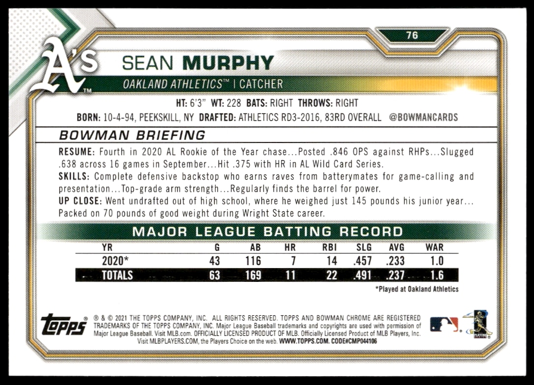 This Baseball card, from 2021 is part of the Bowman card set. Sean Murphy is featured and has a card number of 76.