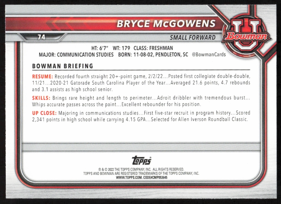 This Basketball card, from 2021 is part of the Bowman University card set. Bryce McGowens is featured and has a card number of 74.