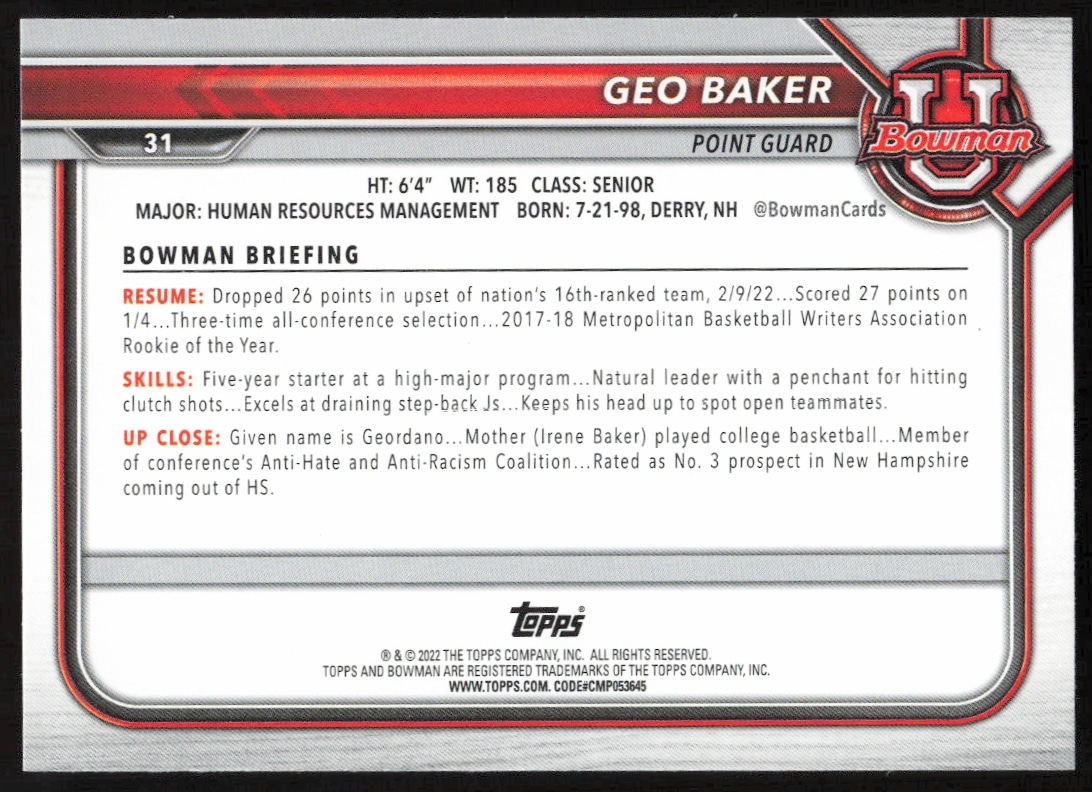2021 Bowman University Geo Baker #31
