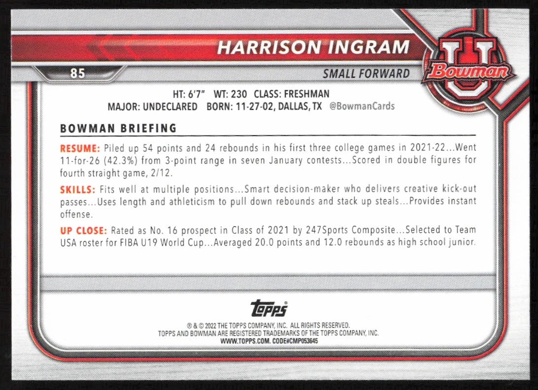 This Basketball card, from 2021 is part of the Bowman University card set. Harrison Ingram is featured and has a card number of 85.