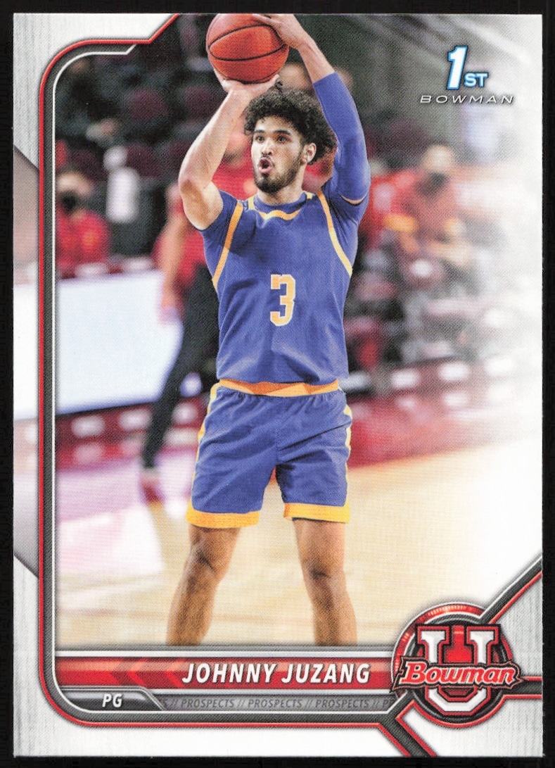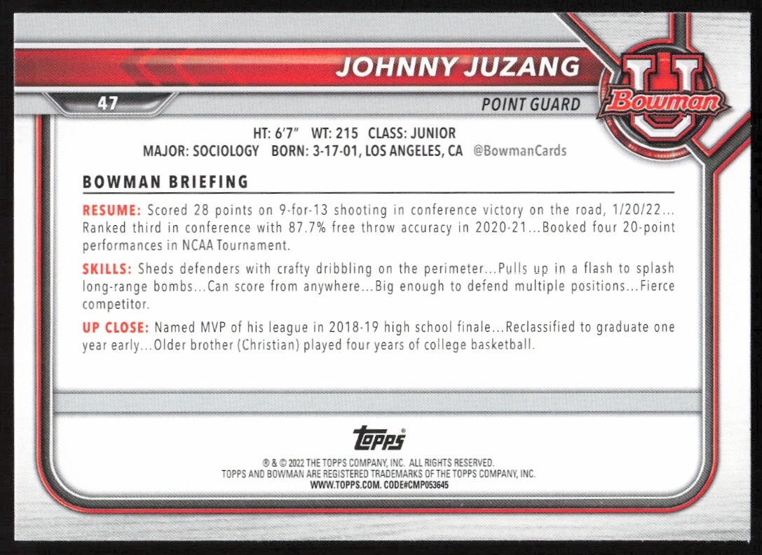This Basketball card, from 2021 is part of the Bowman University card set. Johnny Juzang is featured and has a card number of 47.