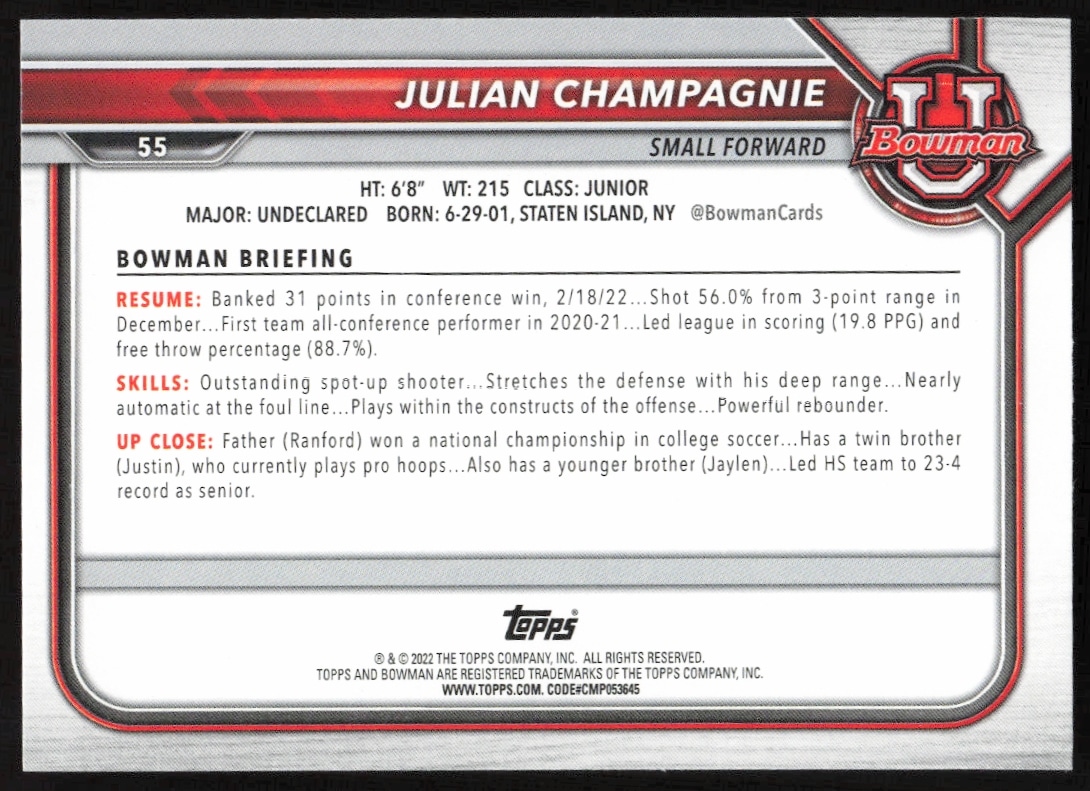 This Basketball card, from 2021 is part of the Bowman University card set. Julian Champagnie is featured and has a card number of 55.