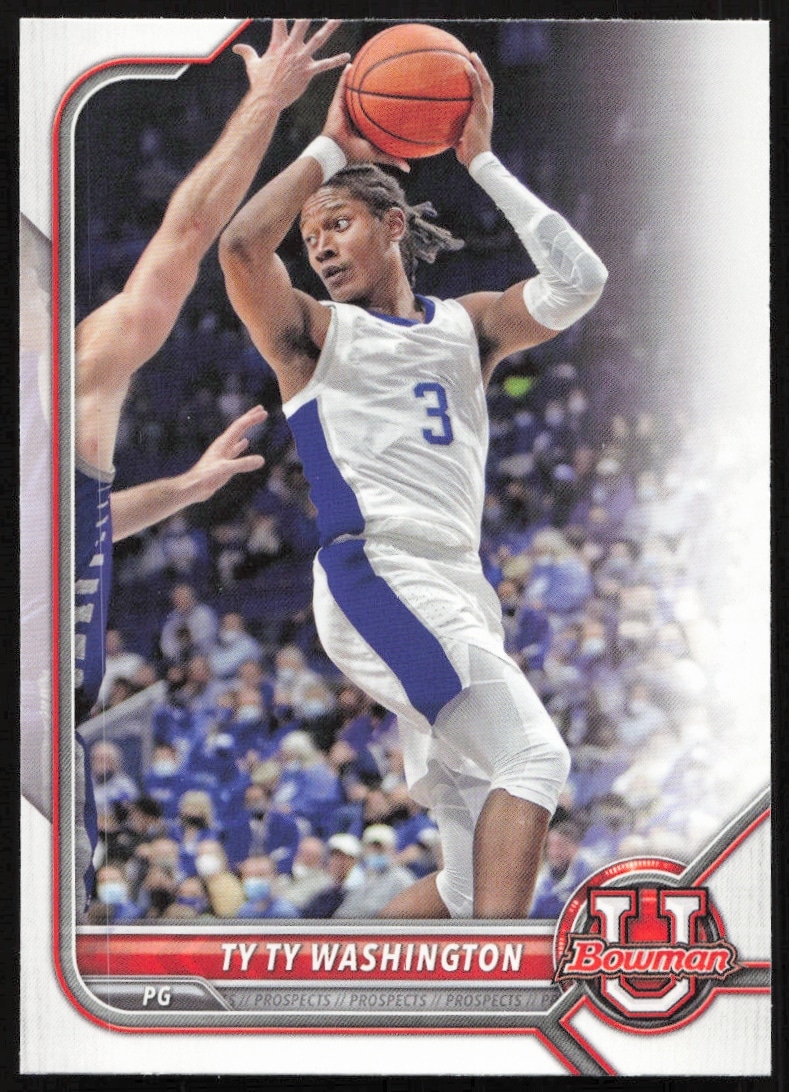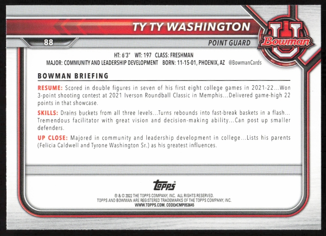 This Basketball card, from 2021 is part of the Bowman University card set. Ty Ty Washington is featured and has a card number of 88.