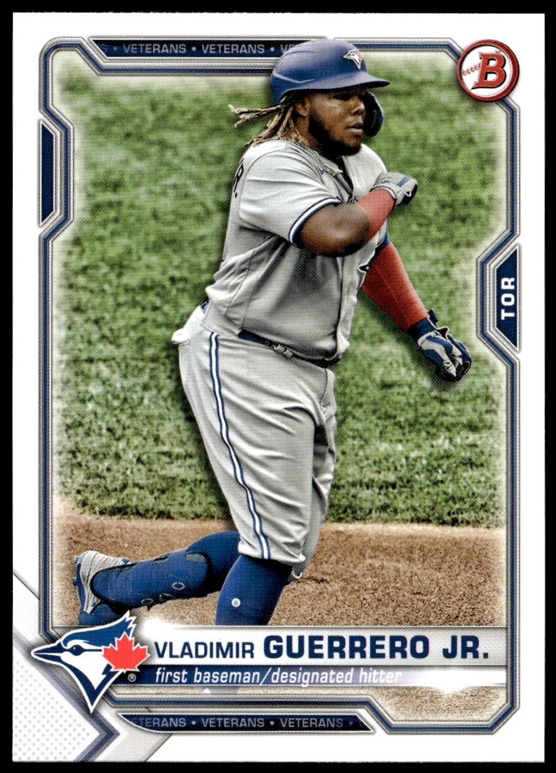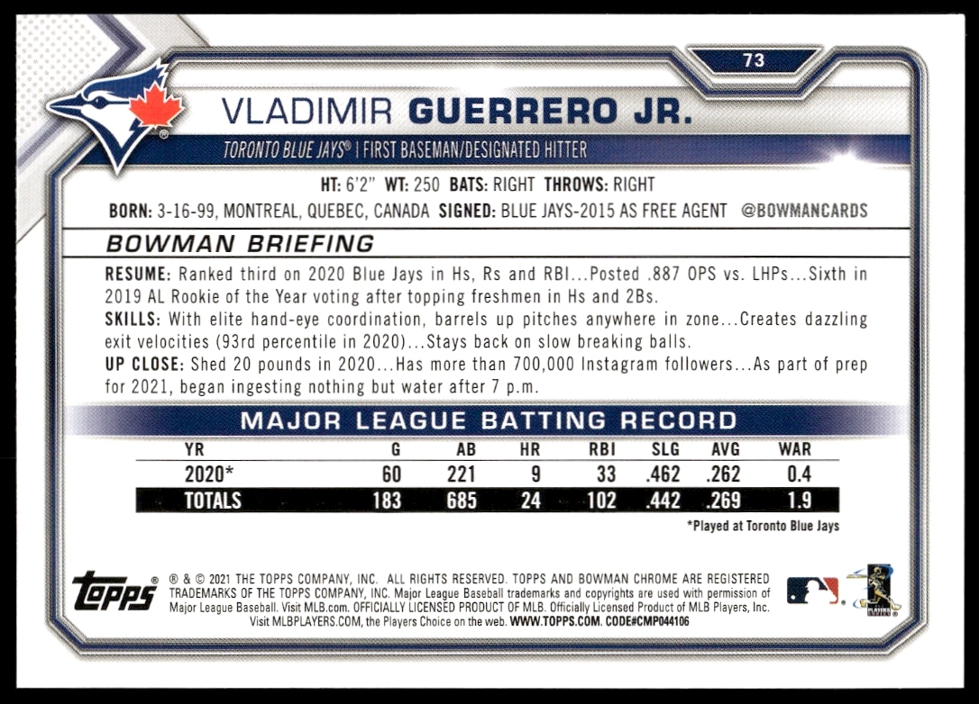 This Baseball card, from 2021 is part of the Bowman card set. Vladimir Guerrero Jr. is featured and has a card number of 73.