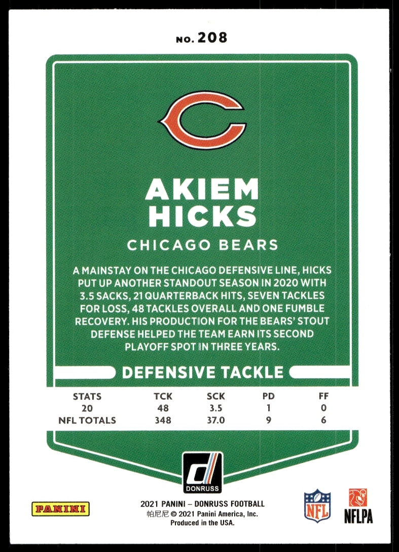 This Football card, from 2021 is part of the Donruss card set. Akiem Hicks is featured and has a card number of 208.