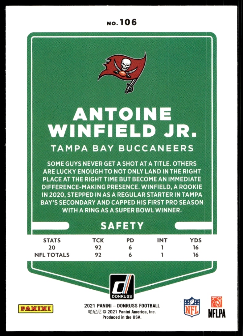 This Football card, from 2021 is part of the Donruss card set. Antoine Winfield Jr. is featured and has a card number of 106.