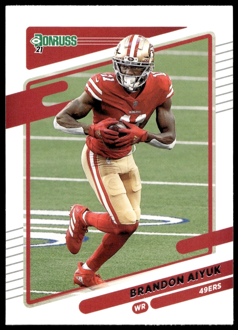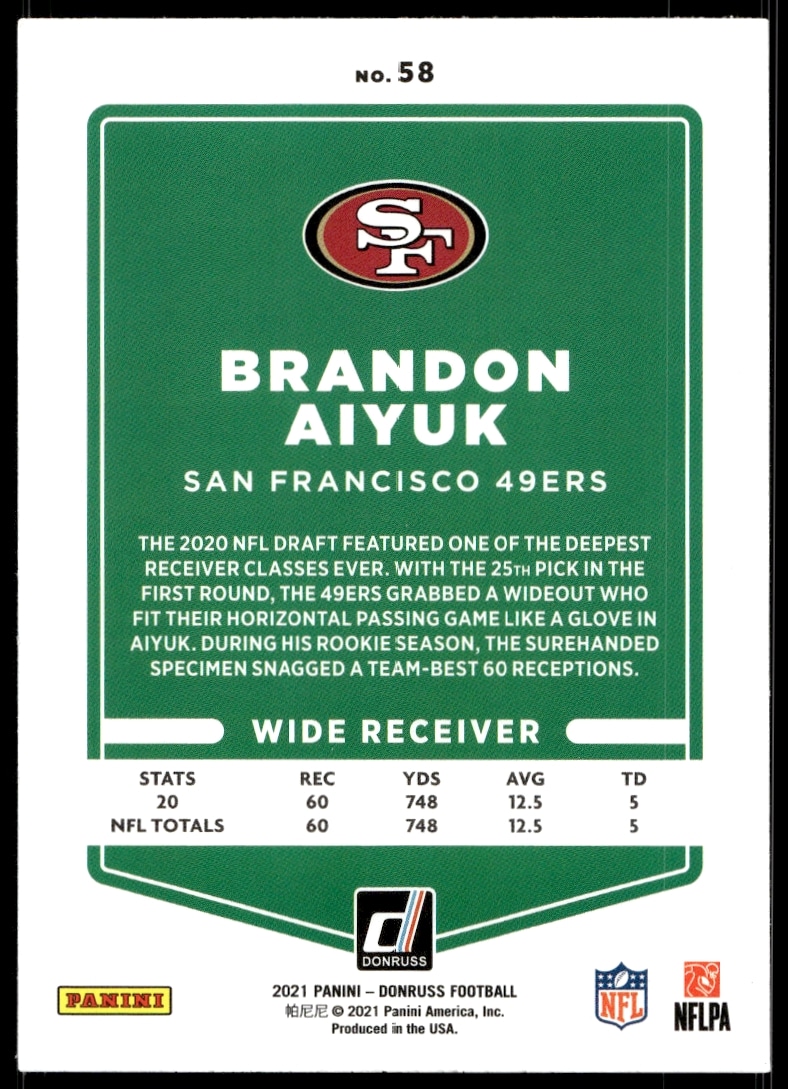 This Football card, from 2021 is part of the Donruss card set. Brandon Aiyuk is featured and has a card number of 58.