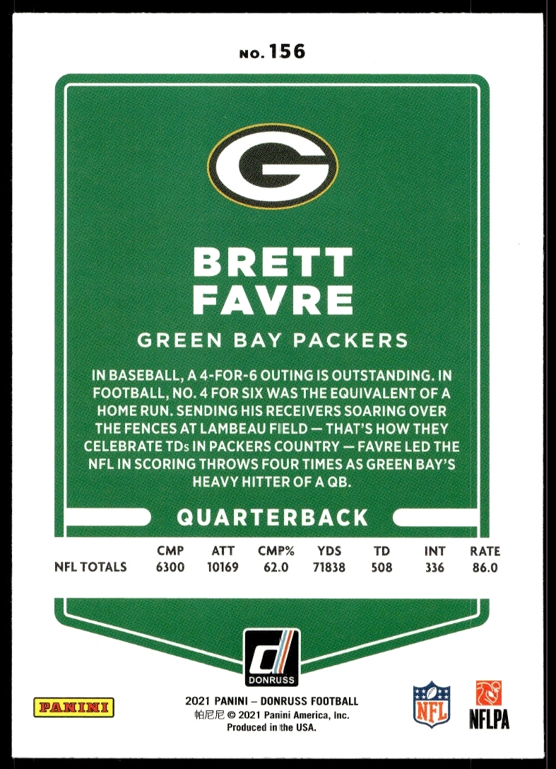 This Football card, from 2021 is part of the Donruss card set. Brett Favre is featured and has a card number of 156.