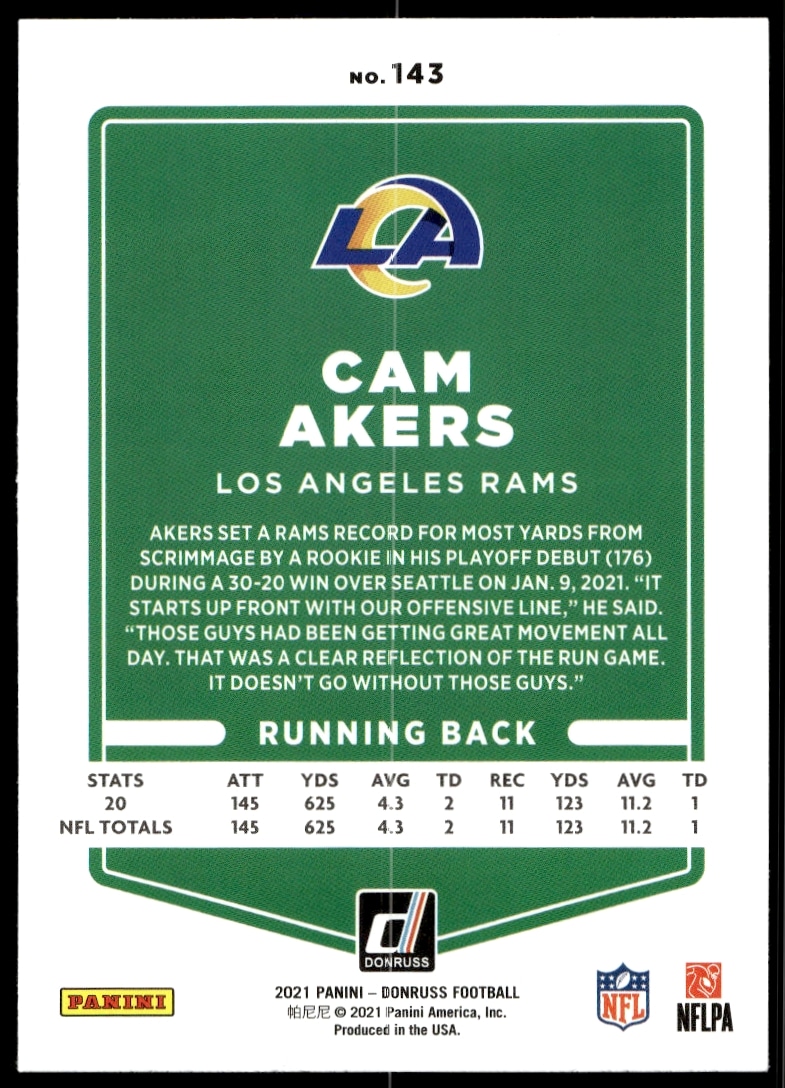 This Football card, from 2021 is part of the Donruss card set. Cam Akers is featured and has a card number of 143.