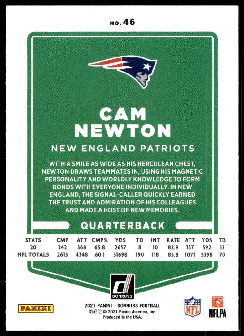 This Football card, from 2021 is part of the Donruss card set. Cam Newton is featured and has a card number of 46.