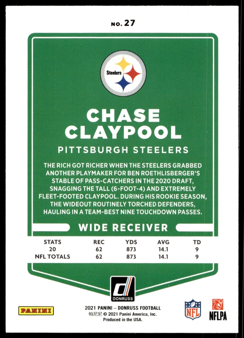 This Football card, from 2021 is part of the Donruss card set. Chase Claypool is featured and has a card number of 27.