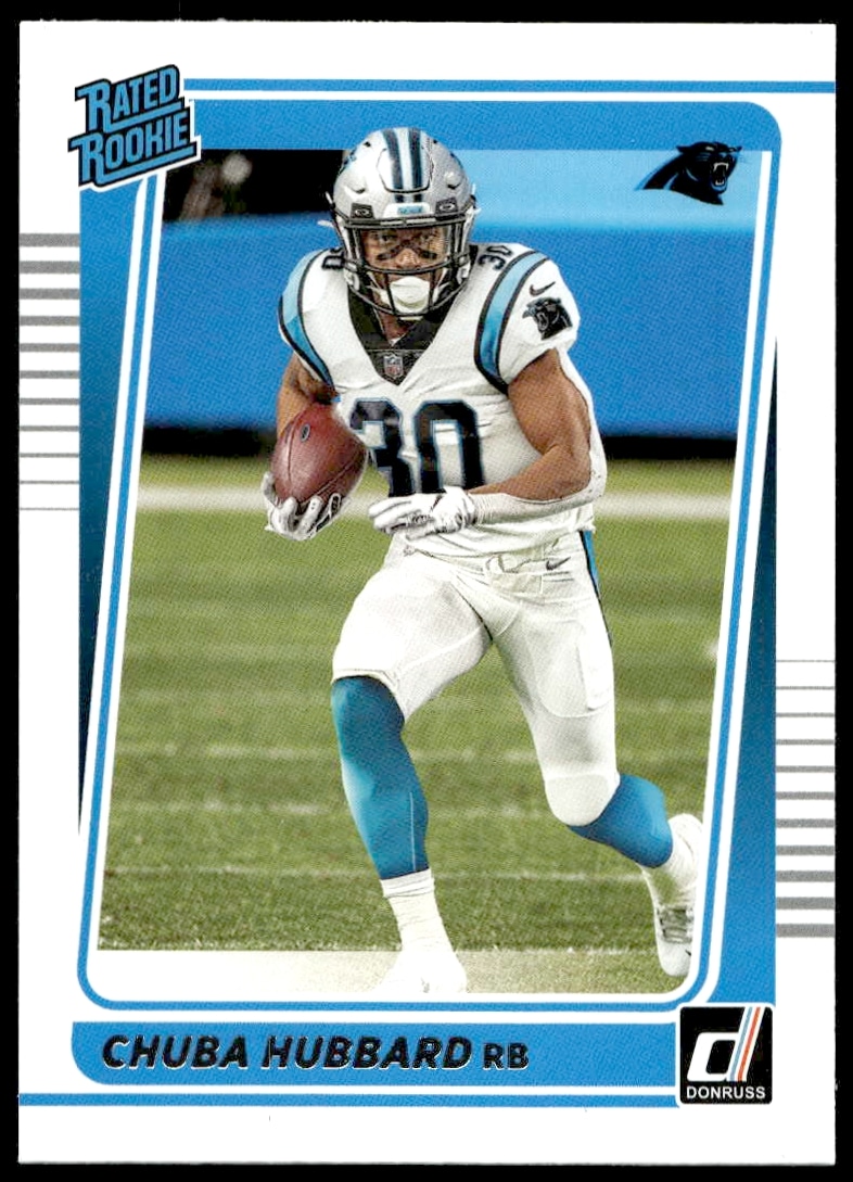 This Football card, from 2021 is part of the Donruss card set. Chuba Hubbard is featured and has a card number of 287.