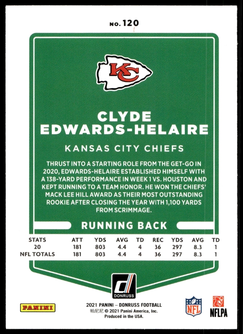 This Football card, from 2021 is part of the Donruss card set. Clyde Edwards-Helaire is featured and has a card number of 120.
