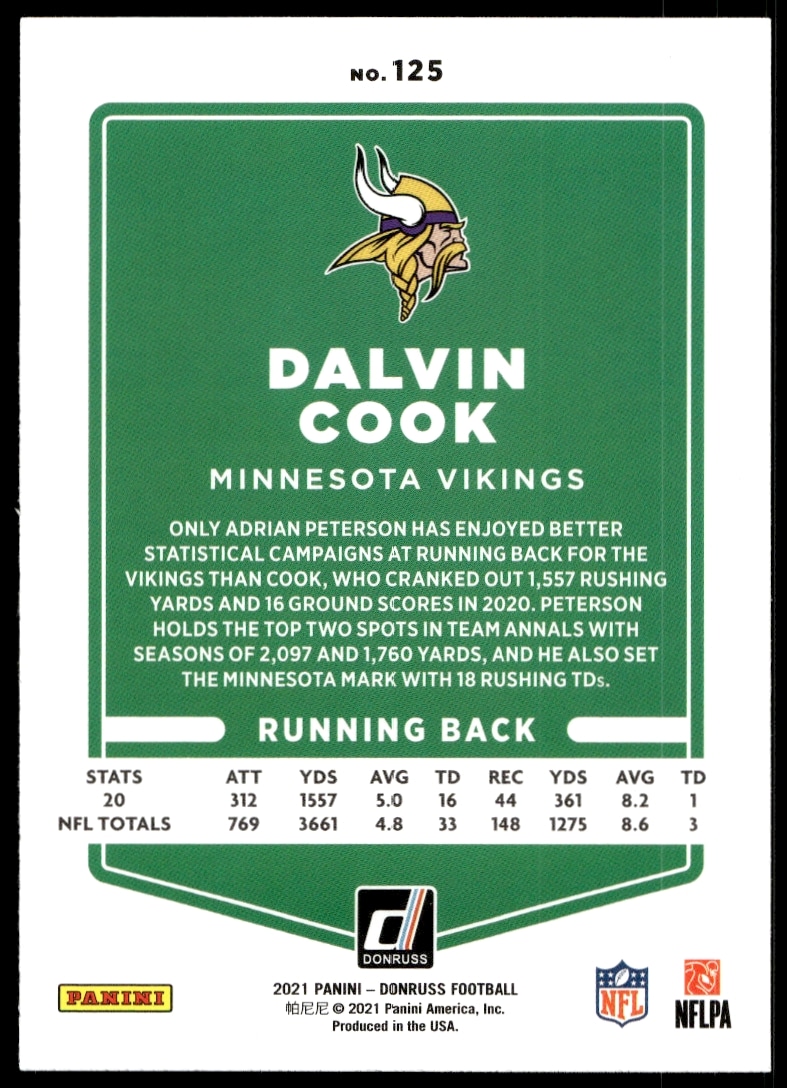 This Football card, from 2021 is part of the Donruss card set. Dalvin Cook is featured and has a card number of 125.