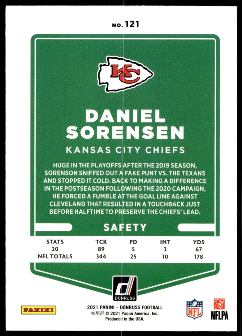 This Football card, from 2021 is part of the Donruss card set. Daniel Sorensen is featured and has a card number of 121.