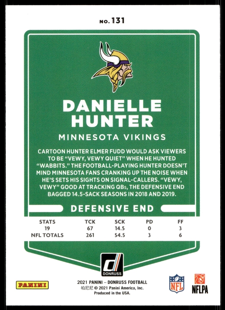 This Football card, from 2021 is part of the Donruss card set. Danielle Hunter is featured and has a card number of 131.