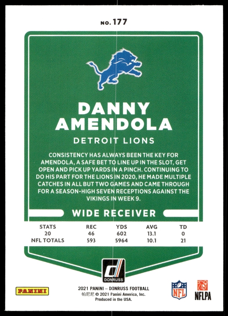 This Football card, from 2021 is part of the Donruss card set. Danny Amendola is featured and has a card number of 177.