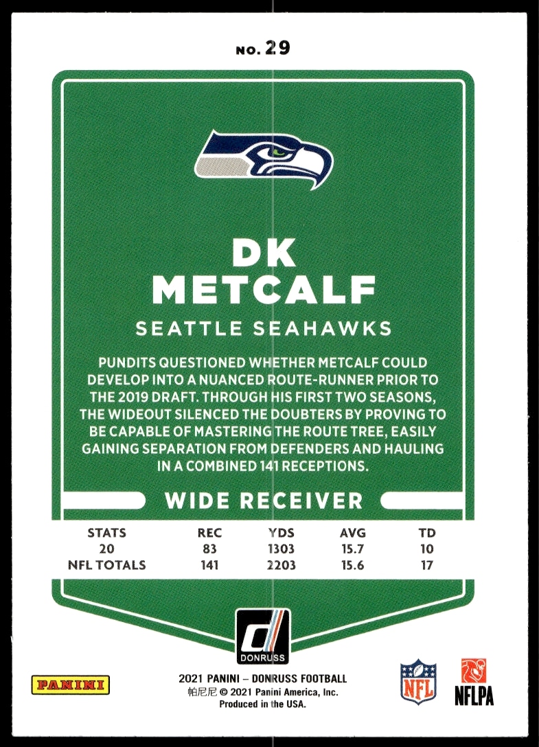 This Football card, from 2021 is part of the Donruss card set. DK Metcalf is featured and has a card number of 29.