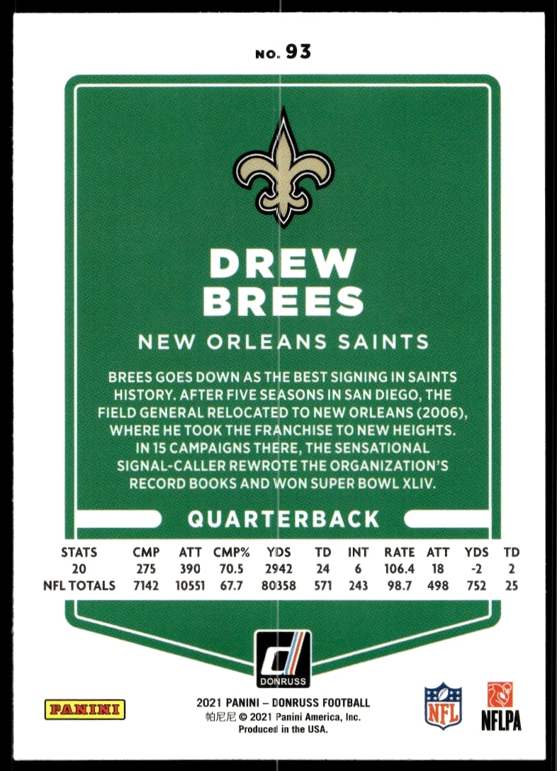 This Football card, from 2021 is part of the Donruss card set. Drew Brees is featured and has a card number of 93.