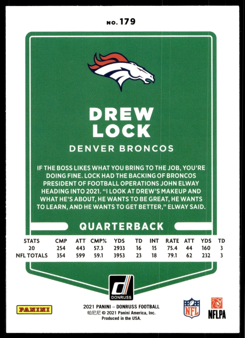 This Football card, from 2021 is part of the Donruss card set. Drew Lock is featured and has a card number of 179.