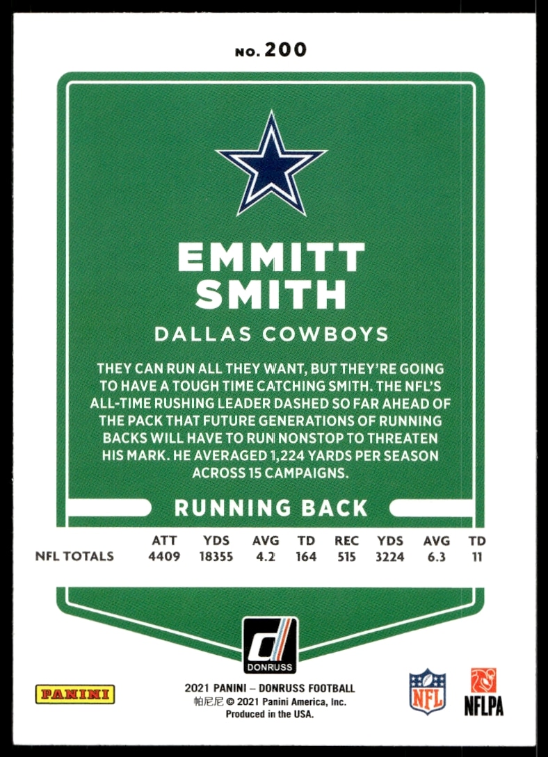 This Football card, from 2021 is part of the Donruss card set. Emmitt Smith is featured and has a card number of 200.