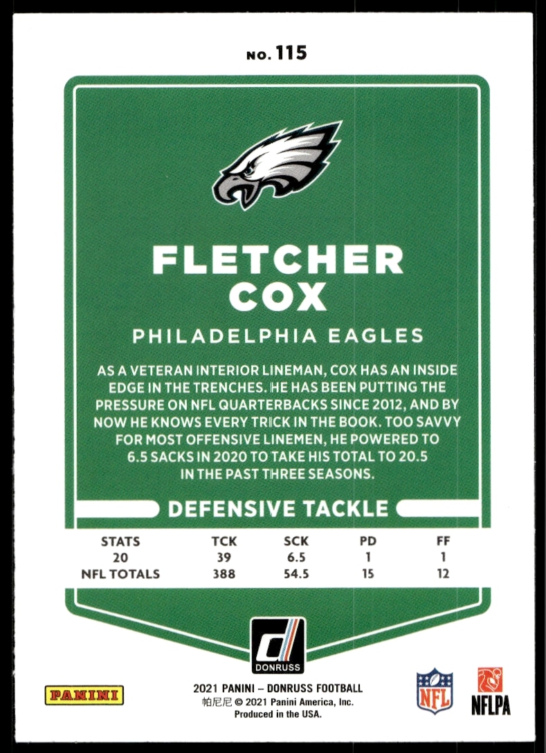 This Football card, from 2021 is part of the Donruss card set. Fletcher Cox is featured and has a card number of 115.