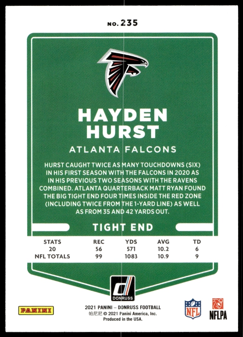 This Football card, from 2021 is part of the Donruss card set. Hayden Hurst is featured and has a card number of 235.