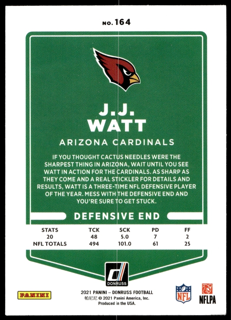 This Football card, from 2021 is part of the Donruss card set. J.J. Watt is featured and has a card number of 164.