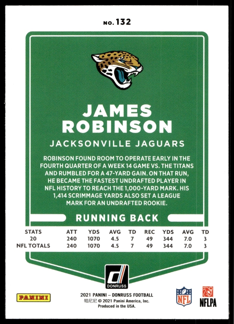 This Football card, from 2021 is part of the Donruss card set. James Robinson is featured and has a card number of 132.