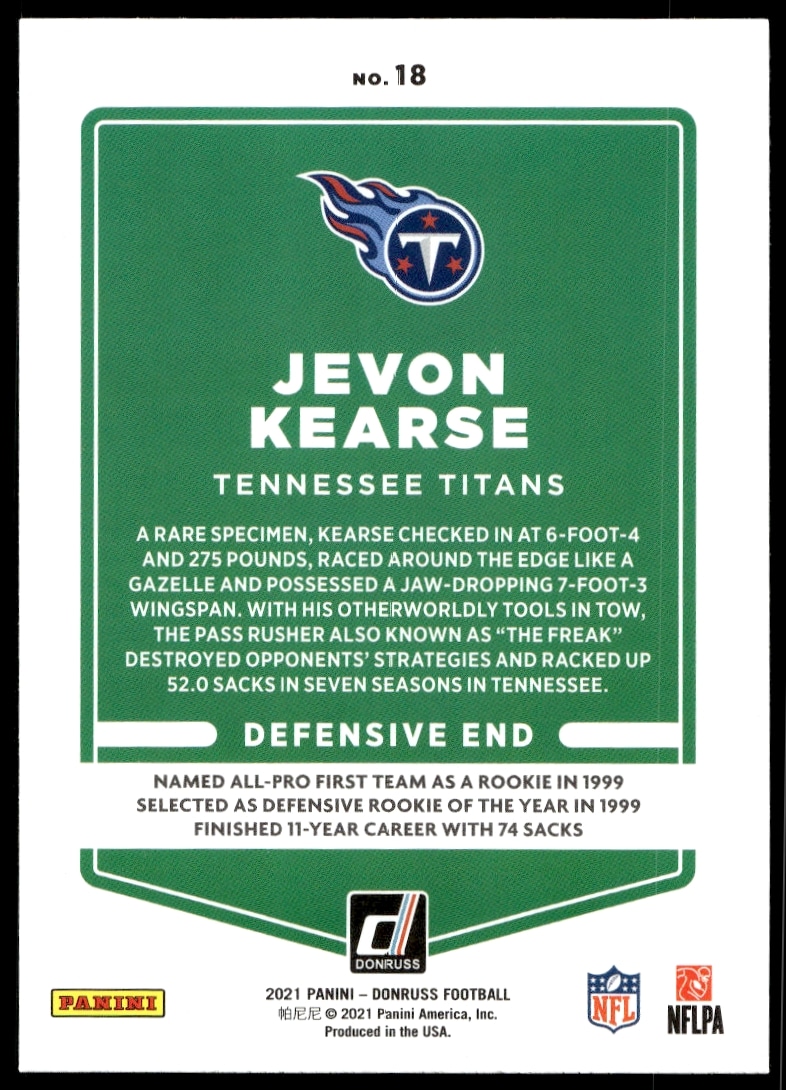 This Football card, from 2021 is part of the Donruss card set. Jevon Kearse is featured and has a card number of 18.