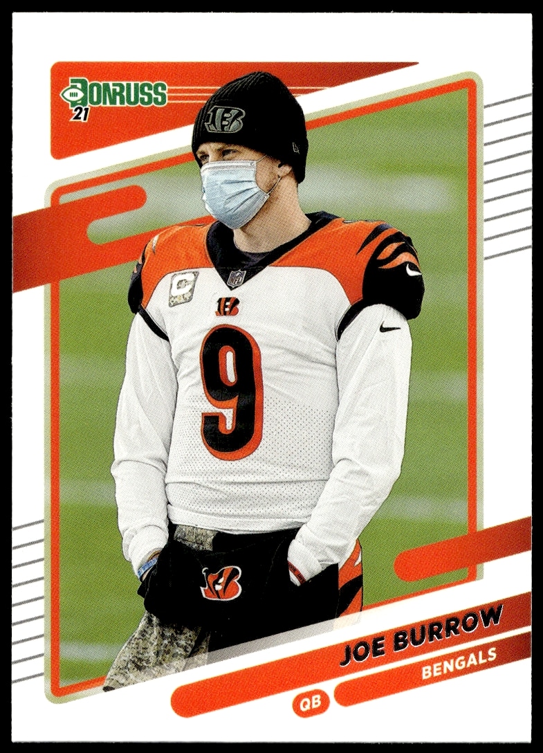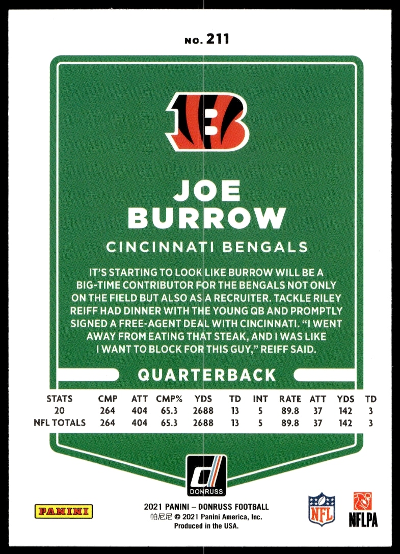 This Football card, from 2021 is part of the Donruss card set. Joe Burrow is featured and has a card number of 211.