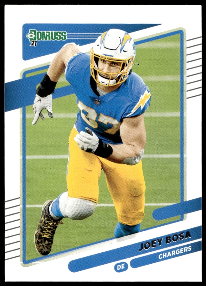This Football card, from 2021 is part of the Donruss card set. Joey Bosa is featured and has a card number of 75.