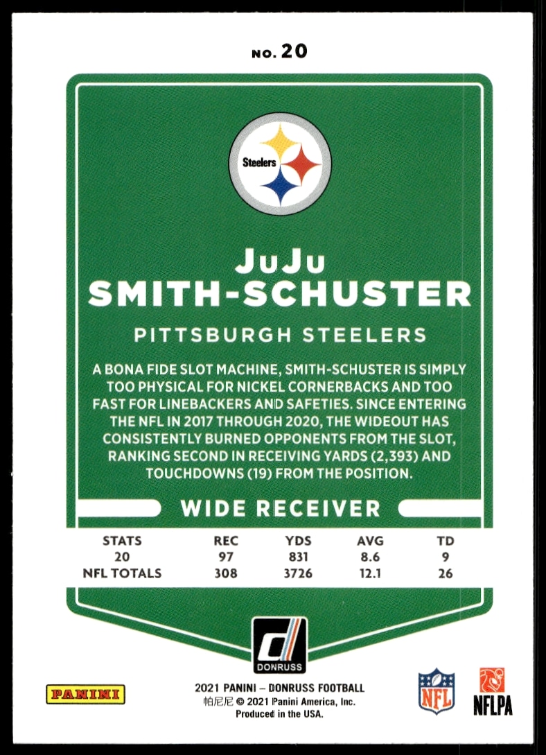 This Football card, from 2021 is part of the Donruss card set. JuJu Smith-Schuster is featured and has a card number of 20.