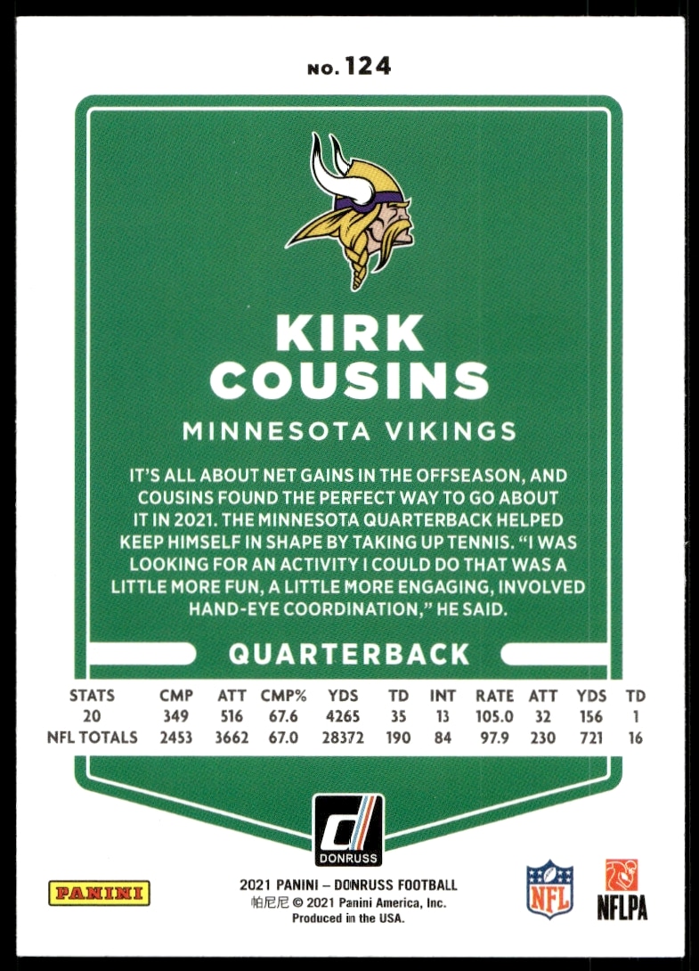 This Football card, from 2021 is part of the Donruss card set. Kirk Cousins is featured and has a card number of 124.