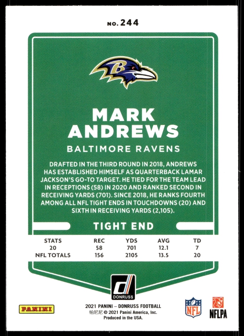 This Football card, from 2021 is part of the Donruss card set. Mark Andrews is featured and has a card number of 244.