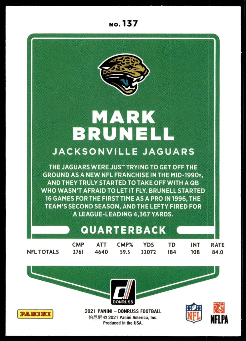 This Football card, from 2021 is part of the Donruss card set. Mark Brunell is featured and has a card number of 137.