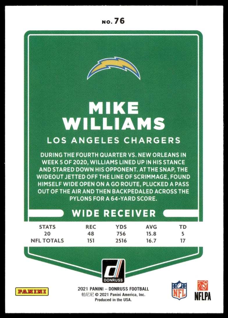 This Football card, from 2021 is part of the Donruss card set. Mike Williams is featured and has a card number of 76.