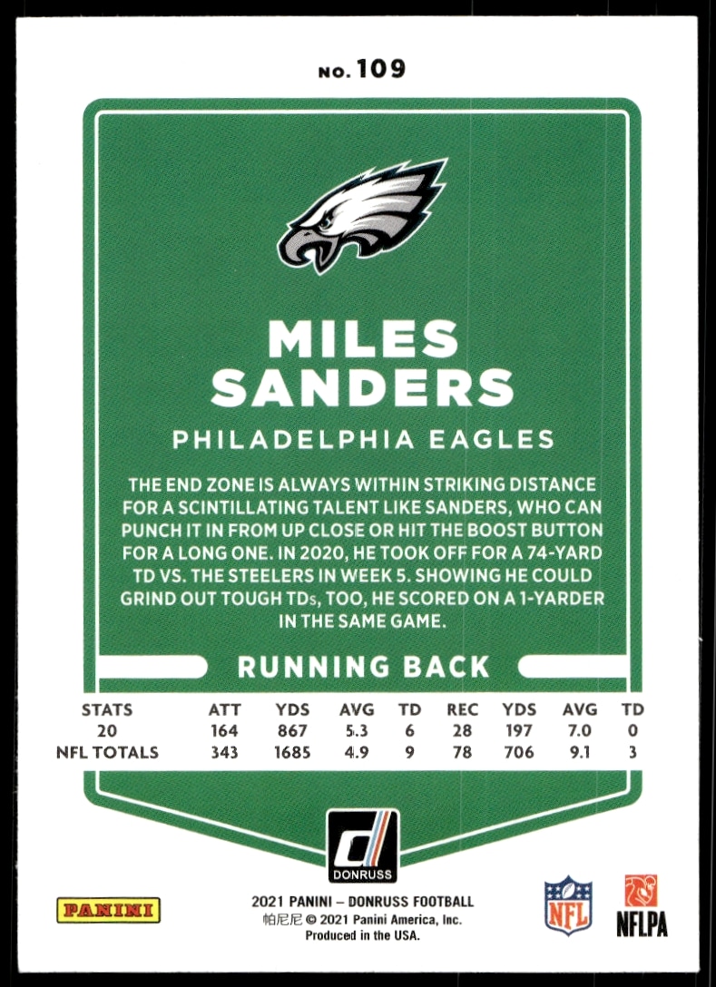 This Football card, from 2021 is part of the Donruss card set. Miles Sanders is featured and has a card number of 109.