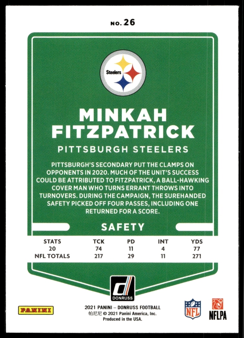 This Football card, from 2021 is part of the Donruss card set. Minkah Fitzpatrick is featured and has a card number of 26.