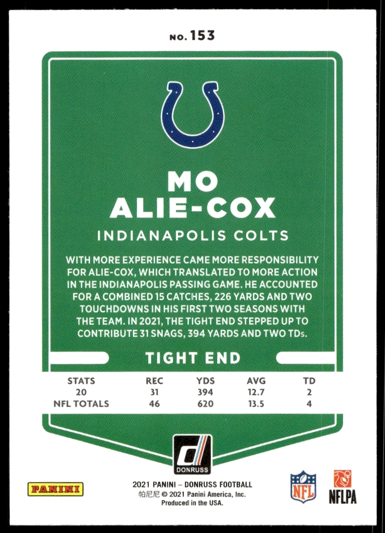 This Football card, from 2021 is part of the Donruss card set. Mo Alie-Cox is featured and has a card number of 153.