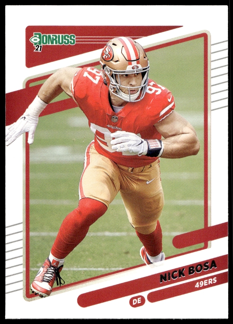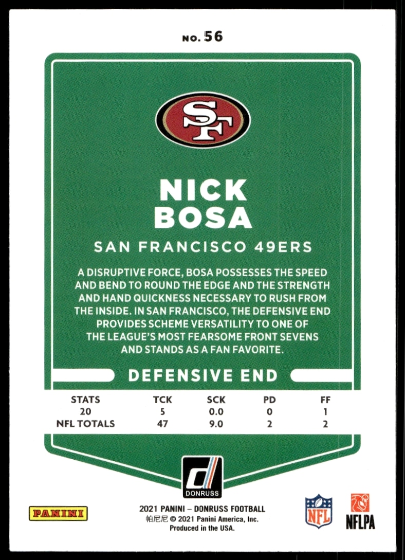 This Football card, from 2021 is part of the Donruss card set. Nick Bosa is featured and has a card number of 56.