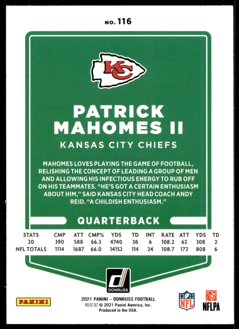 This Football card, from 2021 is part of the Donruss card set. Patrick Mahomes II is featured and has a card number of 116.
