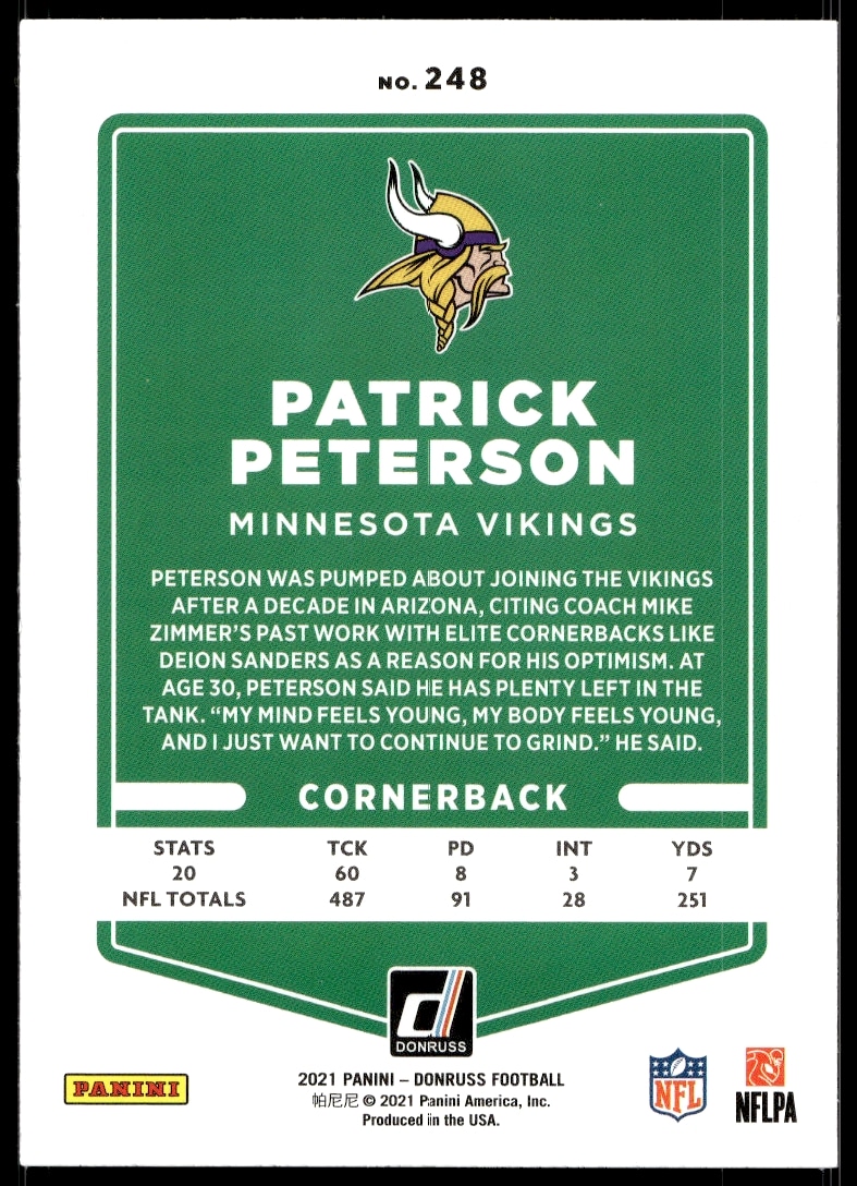 This Football card, from 2021 is part of the Donruss card set. Patrick Peterson is featured and has a card number of 248.
