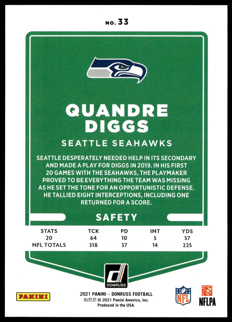 This Football card, from 2021 is part of the Donruss card set. Quandre Diggs is featured and has a card number of 33.